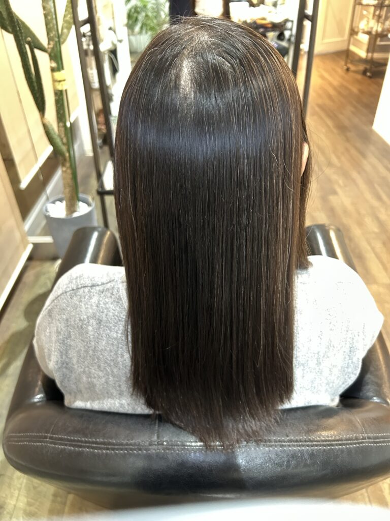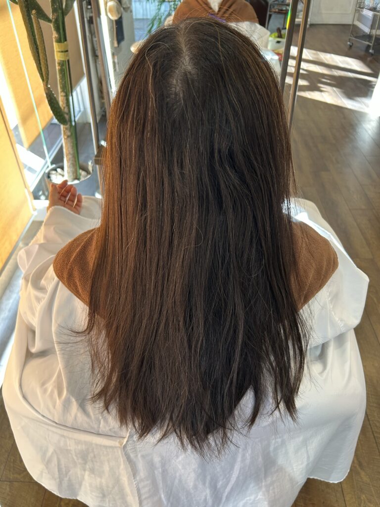 毛先が硬くならないよう薬剤設定を調整し、艶と指通りの良さを重視しました。