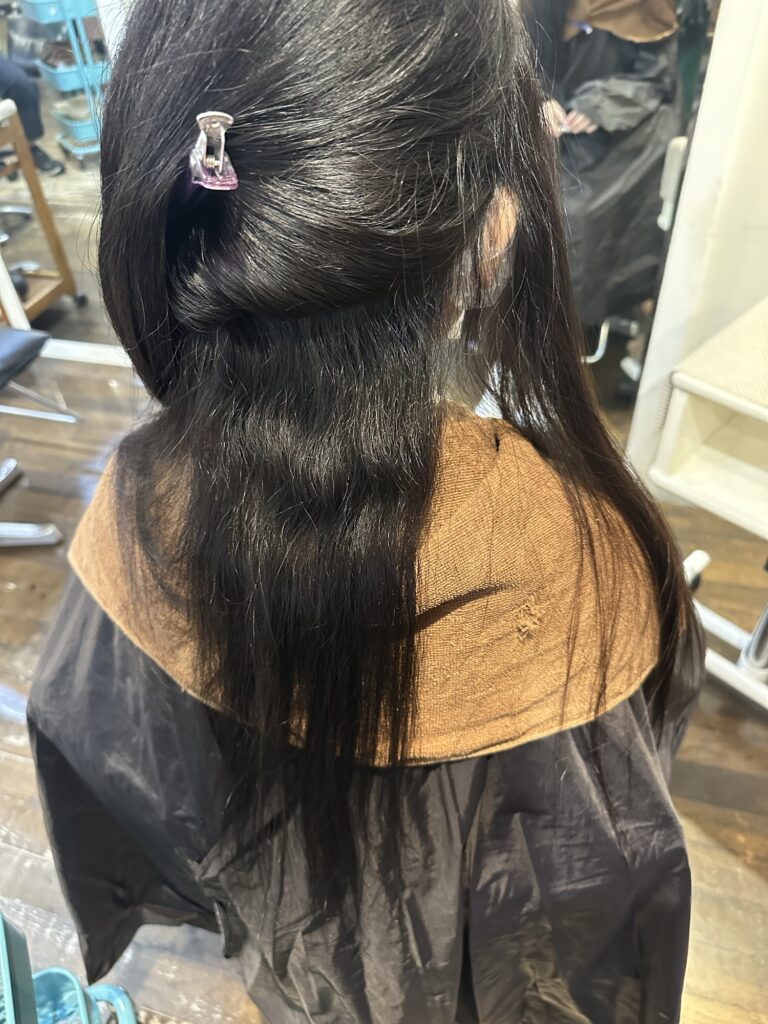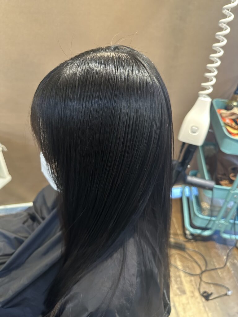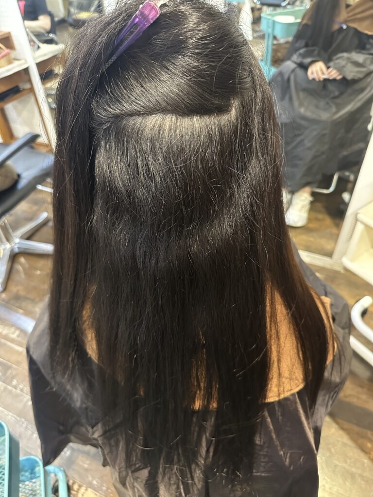 髪のうねりや広がりで毎日のスタイリングに悩む方にとって、縮毛矯正や髪質改善は大きな味方です。特に当店で導入している「iPro(アイプロ)」を使った癖毛改善は、一度施術した部分は半永久的に持続するのが大きな特徴。そのため、今回のように約1年半ぶりのご来店でも、前回施術した部分はしっかりとストレートをキープしており、必要なのは新しく伸びてきた部分へのリタッチだけでした。