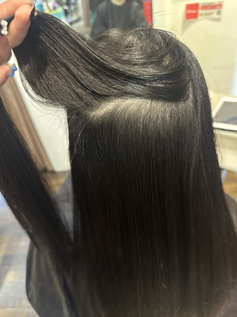 リタッチだからといって単純な施術ではなく、根元の癖やうねりはもちろん、髪の表面に出てくる細かい“パヤパヤ毛”にも丁寧にアプローチできるのがブローチ栄店の強み。アイロン操作や薬剤選定を細かく調整することで、自然なツヤと手触りを保ちながら仕上げることが可能です。