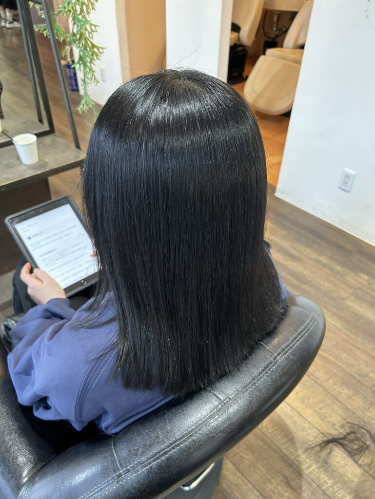 久しぶりの縮毛矯正で、根元からスッと自然なストレートに